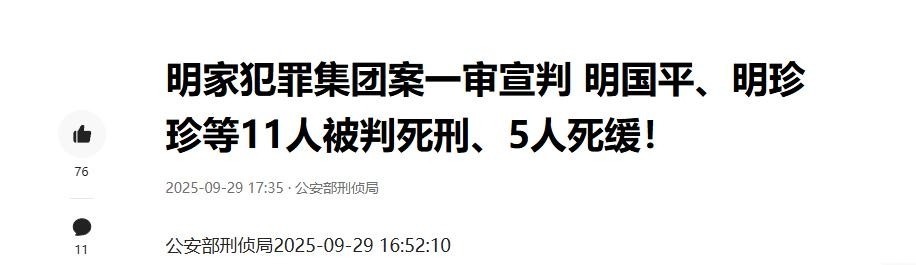信息来源:公安部刑侦局 明家犯罪集团案一审宣判 明国平、明珍珍等11人被判死刑、5人死缓!